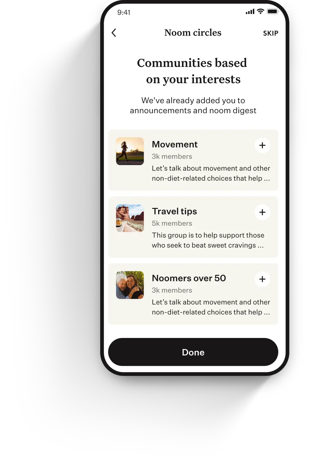 Inspire and get inspired by an enthusiastic community of Noomers just like you with Noom Circles, Noom Vibe, and more.